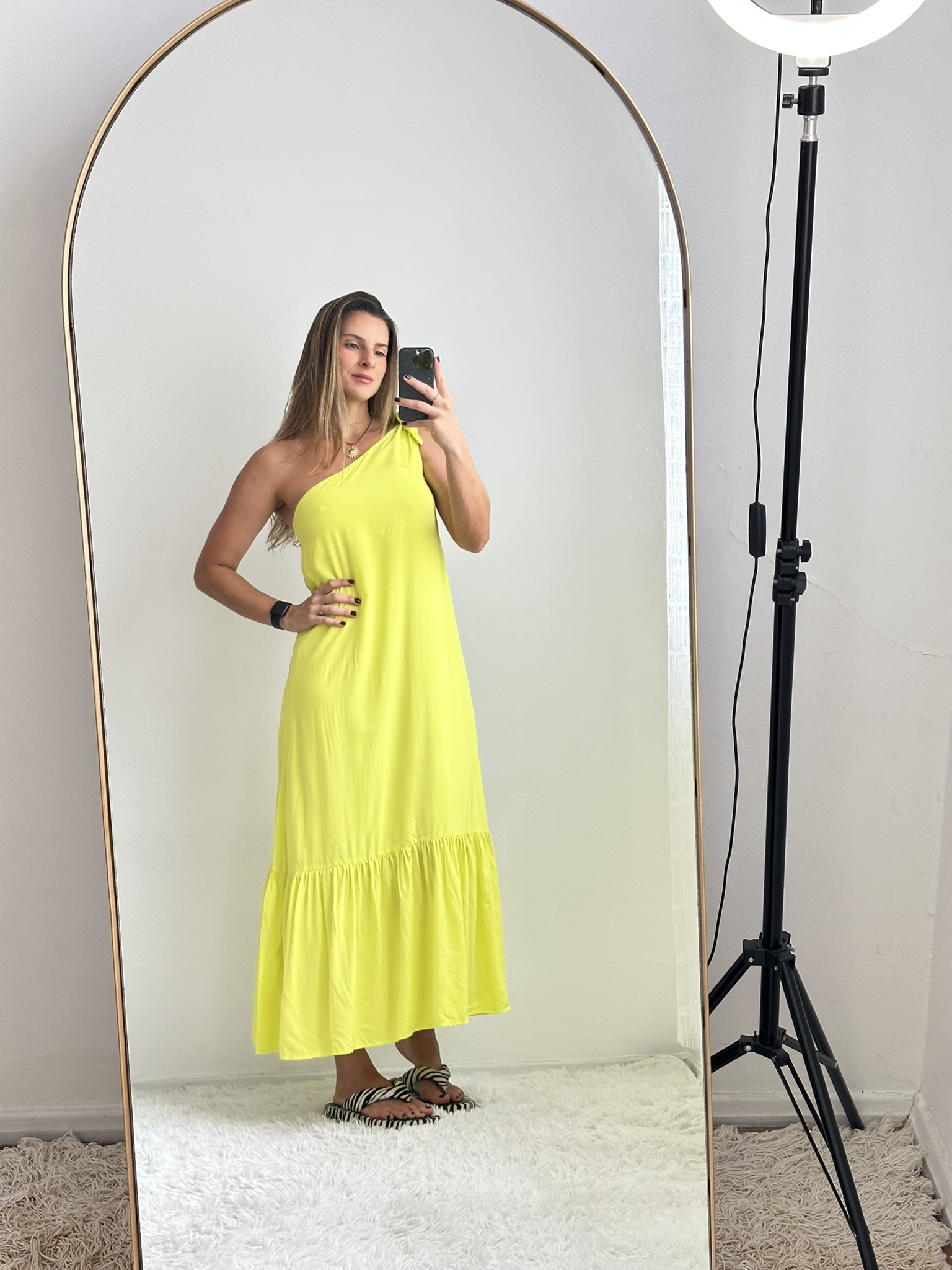 Descrição: largo, com detalhe no ombro, com babado largo no comprimento.